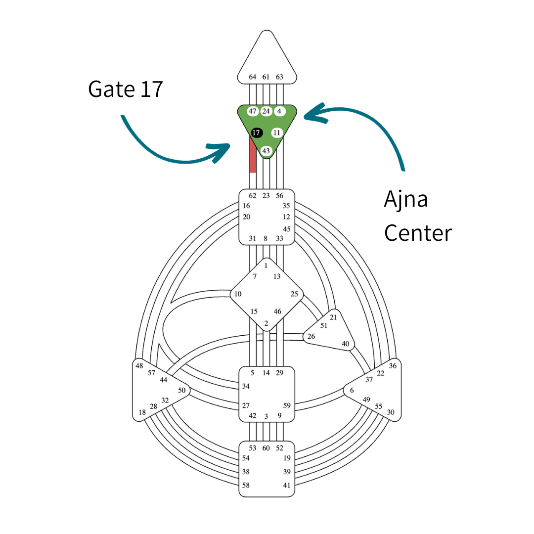 The Ajna Centre governs thinking, conceptualization, beliefs, and mental awareness. Gate 17 operates through logic and pattern recognition, forming opinions based on what it sees and understands about the world.