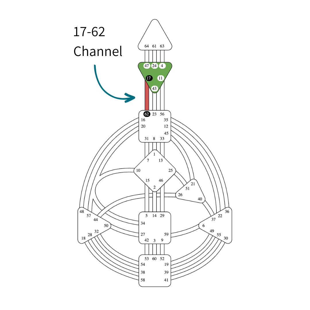 This channel also carries strong organizational and oversight energy. People with the 17–62 channel often make excellent project managers or office managers. They can oversee complex systems and ensure everything works together logically